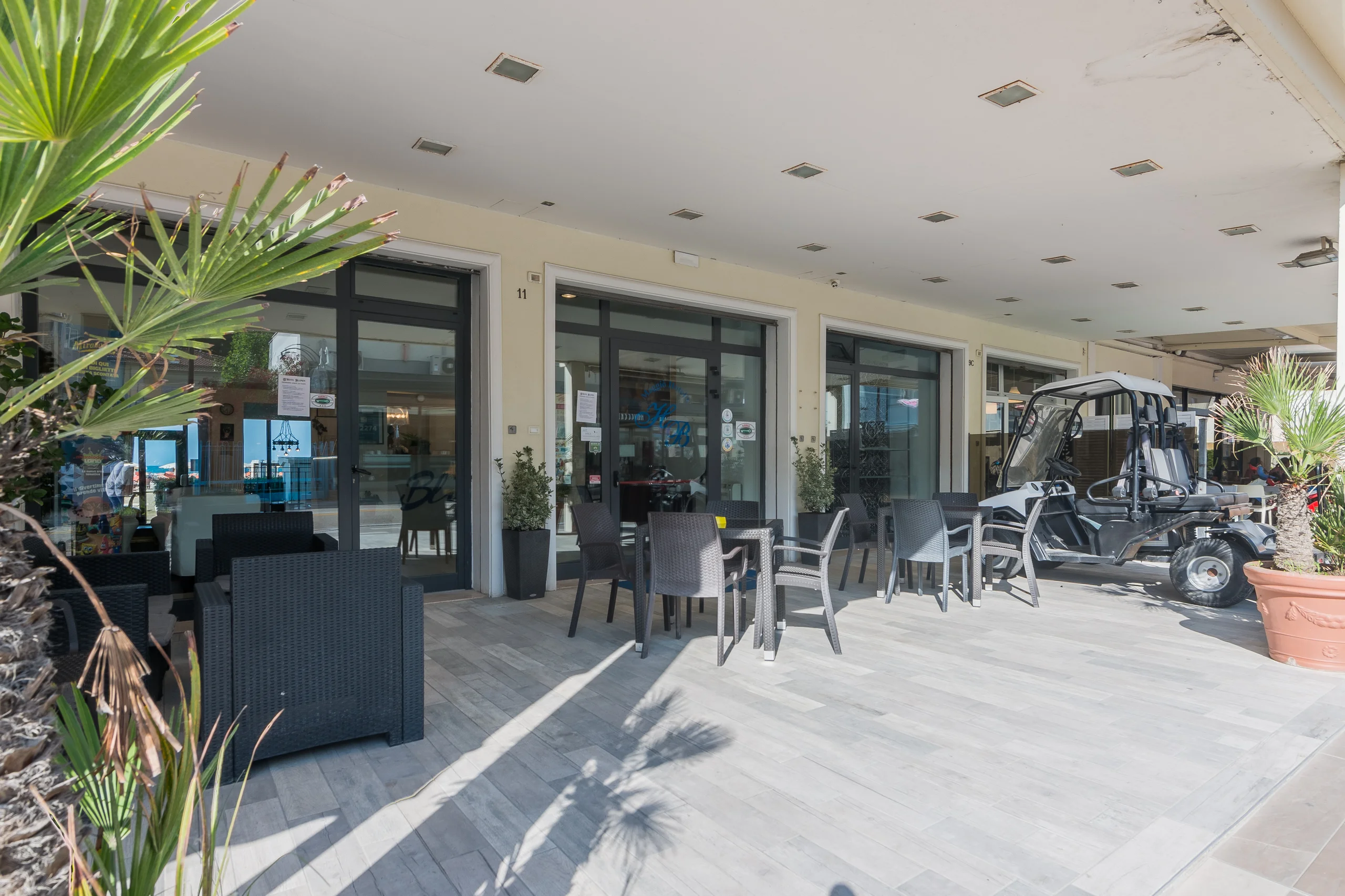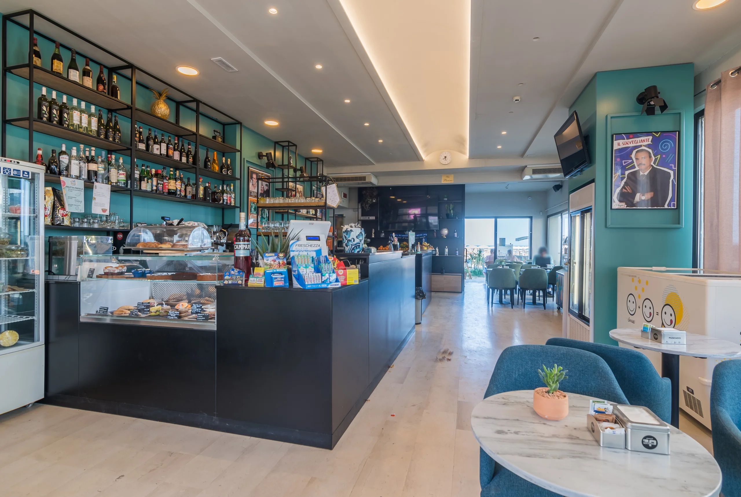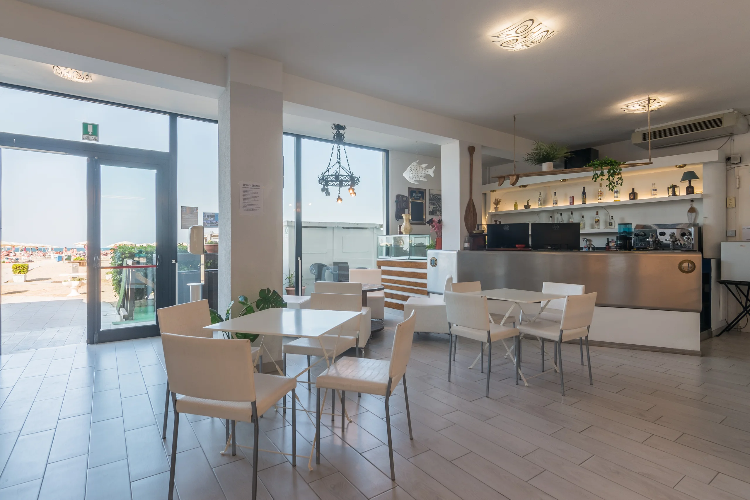 Ci sono inquadrature che un regista cerca per anni. La nostra è fissa: l’Adriatico che cambia colore, il Sangiovese fresco sul tavolo, il lungomare di Viserba che pulsa di vita. La terrazza panoramica è aperta per aperitivi ed eventi. Poi la scena si sposta al bar: fronte spiaggia, cocktail in mano, il rumore delle onde a fare da colonna sonora. Due luoghi. Una sola atmosfera.